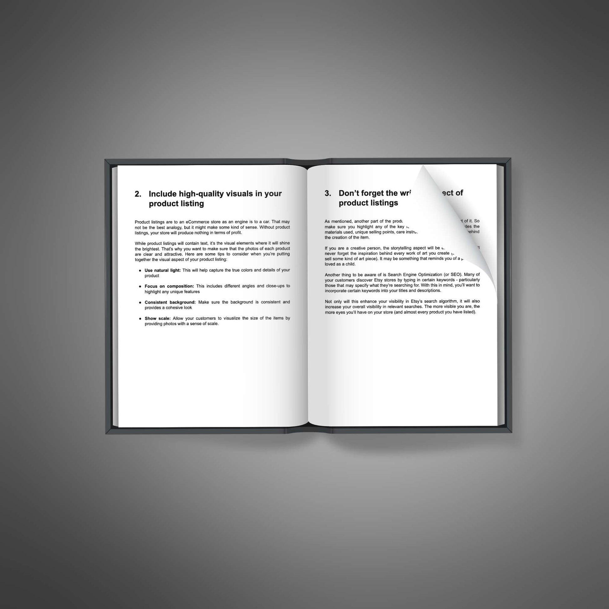 This ebook provides you with practical steps to grow a successful Etsy business. It covers essential tips for choosing the right products, improving product listings, and leveraging SEO and social media to boost sales and customer engagement.